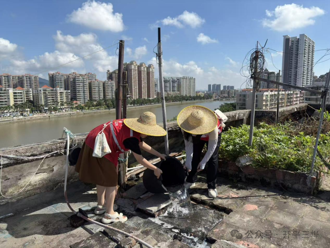 ▲市直單位志愿者到居民屋前、樓頂翻盆倒罐清積水。
