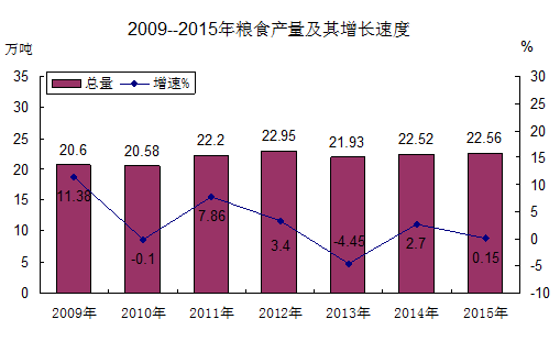 全年糧食總產(chǎn)量22.56萬(wàn)噸,比上年增長(zhǎng)0.15%,其中:稻谷20.79萬(wàn)噸,比上年下降0.09%。