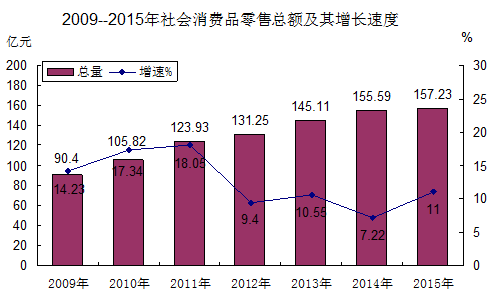 全年社會(huì)消費(fèi)品零售總額157.23億元,比上年增長(zhǎng)11.00%。其中:城市消費(fèi)品零售額111.75億元,比上年增長(zhǎng)12.84%;農(nóng)村消費(fèi)品零售額45.48億元,比上年增長(zhǎng)6.72%。