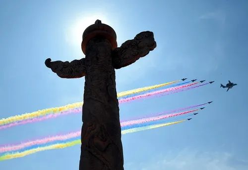 2015年9月3日,中國人民抗日戰(zhàn)爭暨世界反法西斯戰(zhàn)爭勝利70周年紀念大會在北京隆重舉行。這是領(lǐng)隊機梯隊接受檢閱。 新華社記者 王頌 攝