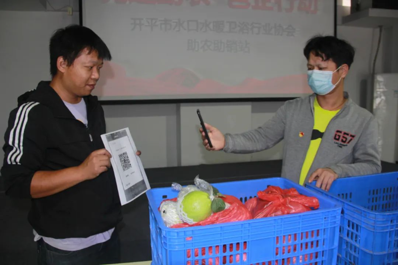 充分調(diào)研后,水口鎮(zhèn)“兩新”黨委迅速行動(dòng),通過黨建引領(lǐng)“搭橋”,發(fā)動(dòng)各黨組織開展“黨建助農(nóng) 邑企行動(dòng)”,助銷農(nóng)產(chǎn)品,貢獻(xiàn)“兩新”力量。水口鎮(zhèn)“兩新”組織成員數(shù)量眾多、分布區(qū)域廣,若農(nóng)戶全部安排送貨上門,運(yùn)輸成本極高。為降低農(nóng)戶銷售成本,方便各黨組織有序選購,開平市水口水暖衛(wèi)浴行業(yè)協(xié)會(huì)成立臨時(shí)助農(nóng)助銷站,提前咨詢周邊黨組織的購買意向數(shù)量,讓果農(nóng)送來協(xié)會(huì)會(huì)議廳臨時(shí)存放,按10元一份包裝好,利用上班時(shí)間為果農(nóng)轉(zhuǎn)銷分銷。只需要掃碼,就能搬貨上車,節(jié)省了各黨組織選購時(shí)間的同時(shí),也為農(nóng)戶分擔(dān)了運(yùn)輸、銷售壓力。
