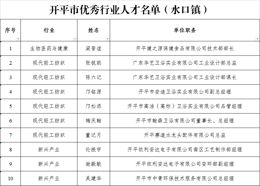 目前,水口鎮(zhèn)成功申報開平市優(yōu)秀行業(yè)人才共10名,其中水暖衛(wèi)浴行業(yè)(現(xiàn)代輕工紡織)人才6名,是“水口衛(wèi)浴”人才隊伍的領軍代表,他們積極發(fā)揮自身專業(yè)優(yōu)勢,為衛(wèi)浴產業(yè)的發(fā)展貢獻了智慧和力量。