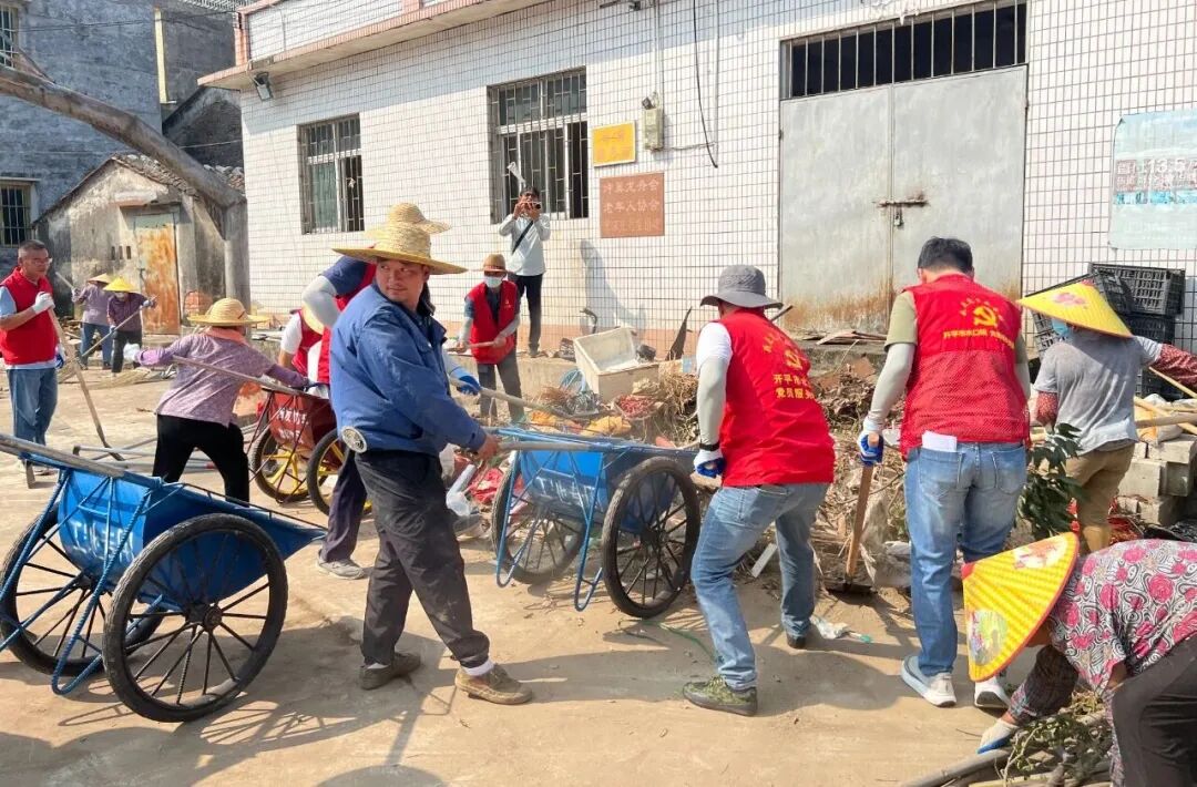 村級主會場的誓師儀式同樣熱血沸騰。10月18日早上,開平市委常委、市委辦公室主任、統(tǒng)戰(zhàn)部部長伍德斌,江門市供銷社副主任、供銷集團董事長鄺衛(wèi)民,水口鎮(zhèn)黨委書記司徒錦泉,鎮(zhèn)黨委副書記、鎮(zhèn)長胡萬程以及支援單位服務(wù)隊、鎮(zhèn)民兵隊伍、綜合行政執(zhí)法隊、義工志愿者、環(huán)衛(wèi)工人等200多人齊聚紅進沖奕村,掀起以“兩清一滅”為核心的全域全員愛國衛(wèi)生運動熱潮。