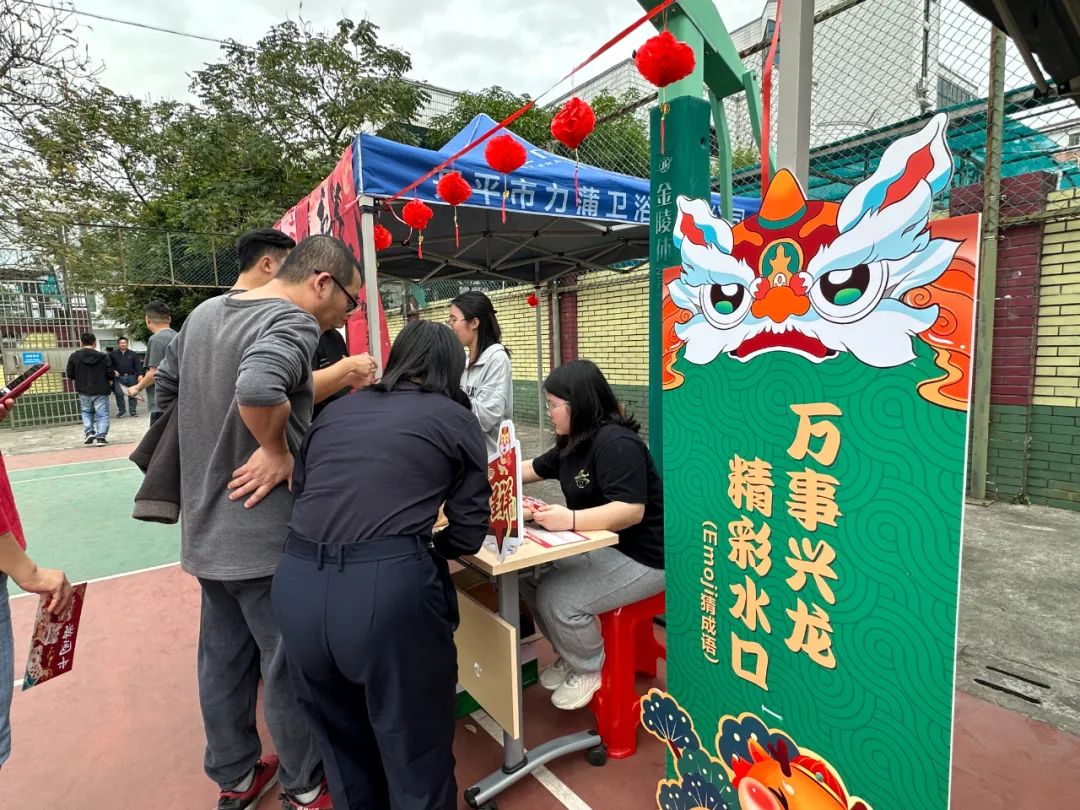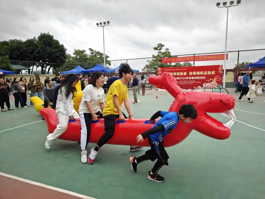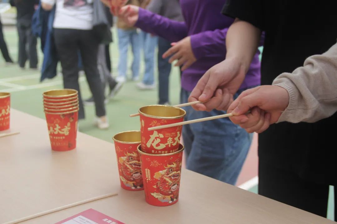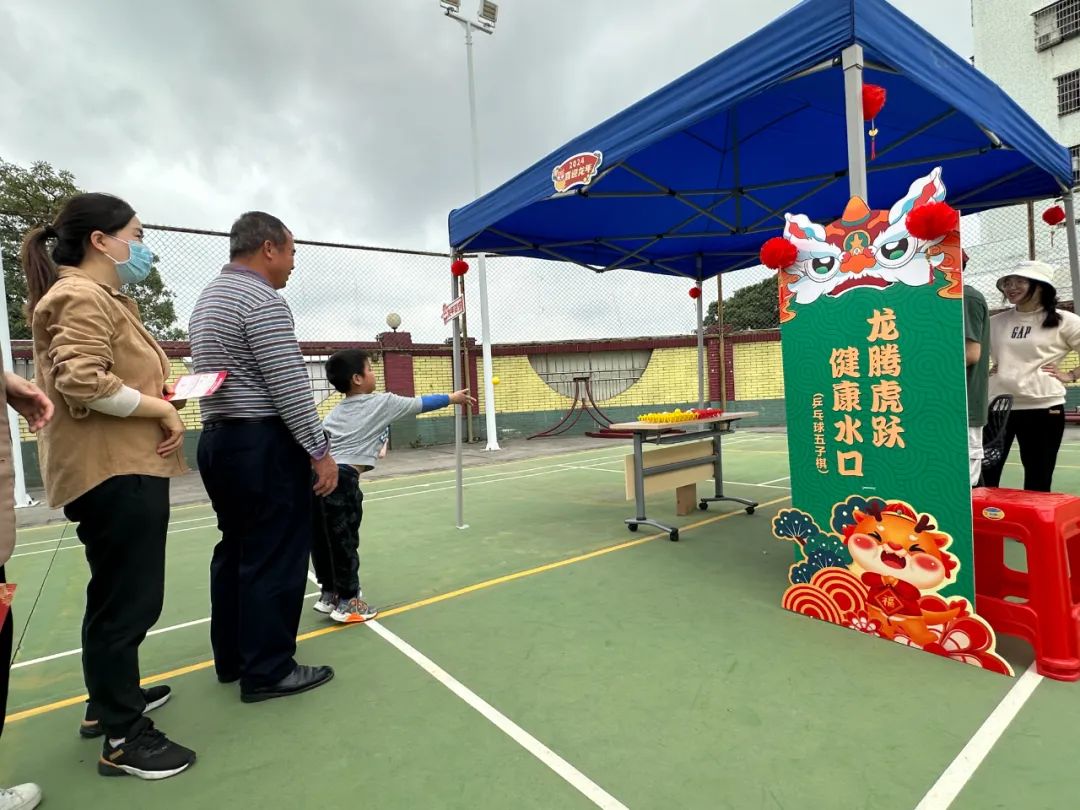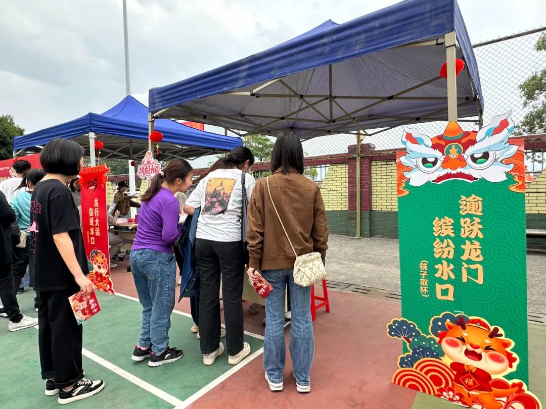 游園活動(dòng)現(xiàn)場(chǎng)設(shè)置了豐富的游戲項(xiàng)目,分別是“欣欣向龍,幸福水口(粘球飛鏢)”“龍飛鳳舞,魅力水口(紙杯抽紙)”“雙龍戲珠,團(tuán)結(jié)水口(旱地龍舟)”“龍行大運(yùn),奮進(jìn)水口(滾滾樂)”“逾躍龍門,團(tuán)結(jié)水口(筷子取杯)”“龍騰虎躍,健康水口(乒乓球五子棋)”“萬事興龍,精彩水口(emoji猜成語)”“好運(yùn)龍龍,活力水口(套圈圈)”“‘龍’重登場(chǎng)。啟起新歲(祝福寄語)”。