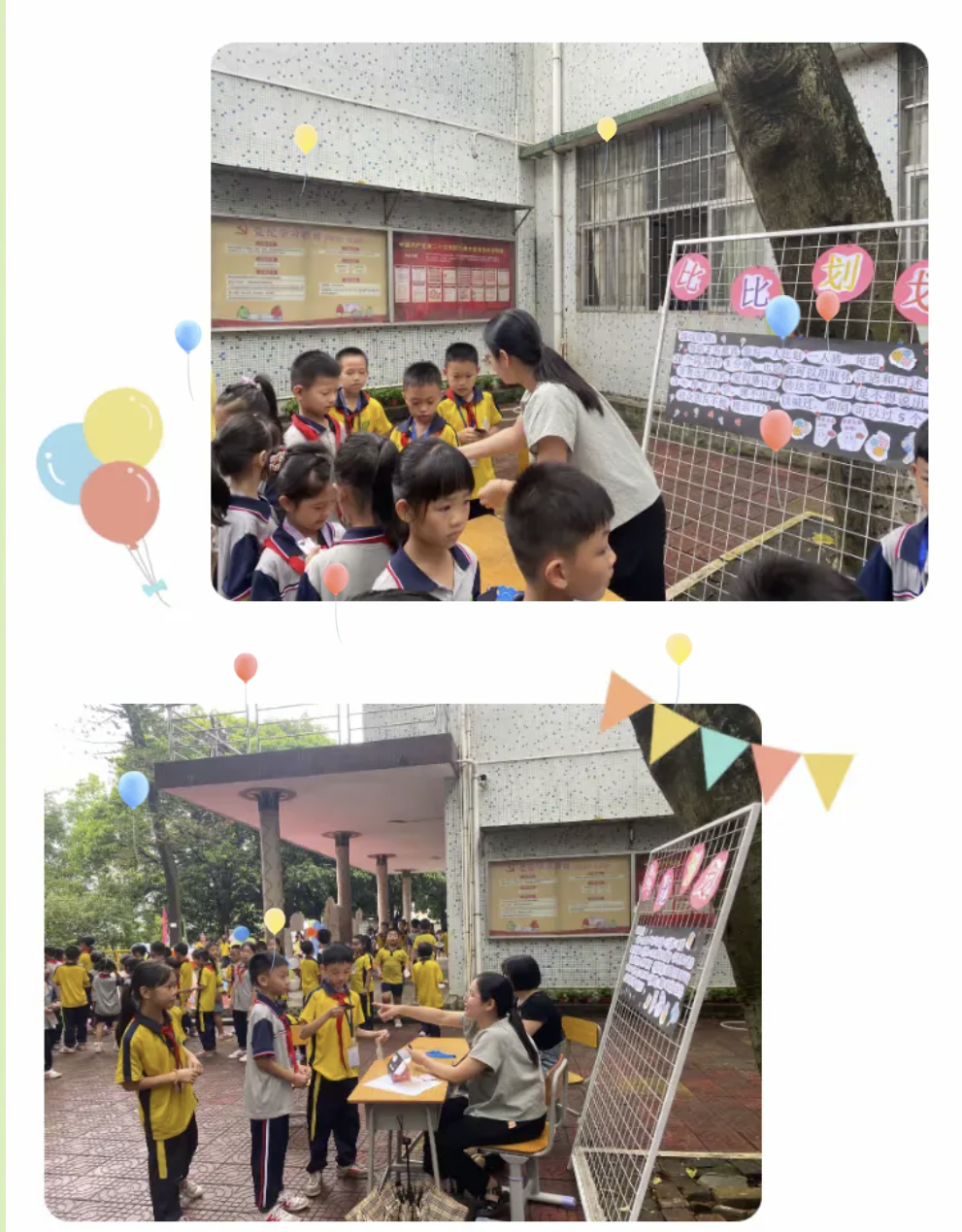 5月31日,致和小學舉辦“童年童趣,暢玩六一”慶“六一”活動,各班精心設計了各種游園項目,還對活動場地進行了精心布置。貼鼻子、夾珠子、投籃、盲人擊鼓、套圈圈、三人夾球……同學們在游玩的過程中不僅收獲開心和快樂,還鍛煉了觀察力,增進了團隊合作精神。整個校園充滿孩子們歡快的笑聲。