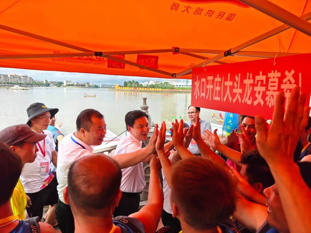 賽前,水口鎮(zhèn)黨委書記司徒錦泉,鎮(zhèn)黨委副書記、鎮(zhèn)長(zhǎng)胡萬程到檢錄區(qū)為轄區(qū)龍舟隊(duì)隊(duì)員提振信心、鼓勁加油。