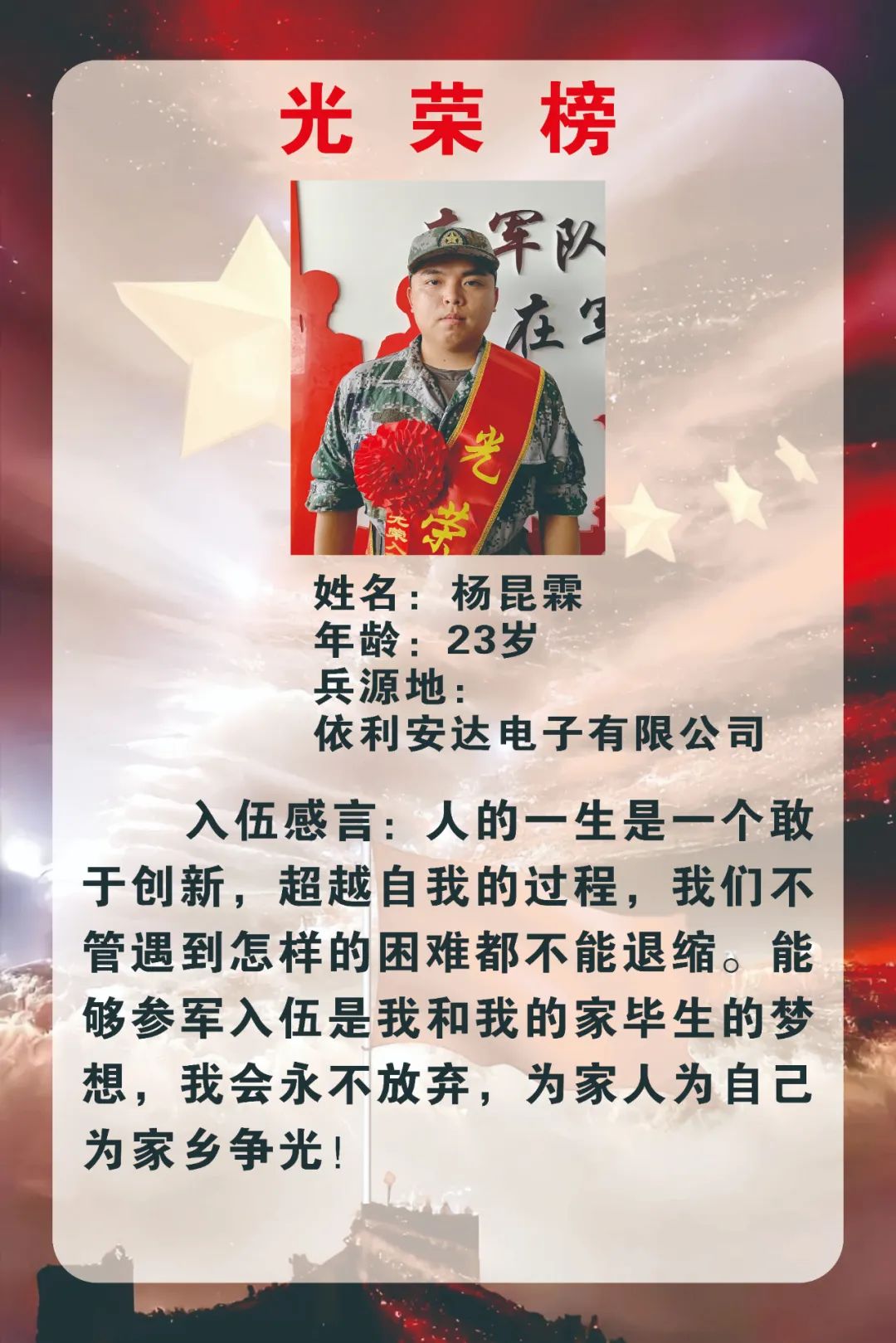 在此輪征兵工作中,開平依利安達電子有限公司廣泛動員滿足條件的青年員工踴躍報名參軍。經過層層篩選,最終2名大學生員工懷揣滿腔熱血與豪情奔赴軍營,踏上保家衛(wèi)國新征程。