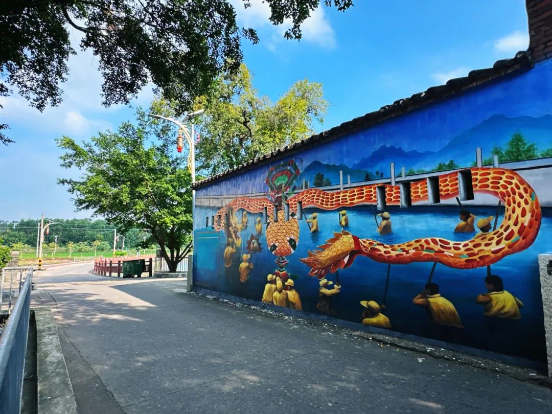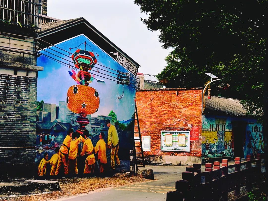 在畫筆起落、線條勾勒、顏料涂抹間,惠農政策、燈會活動、喜慶醒獅、金黃稻田、古樸農舍、美麗庭院以及紅線女粵劇文化等泮村特色文化元素躍然白墻黛瓦,既展現了黨建引領作用的生動場景,又彰顯泮村村在推進“百千萬工程”和鄉(xiāng)村振興上的豐碩成果。