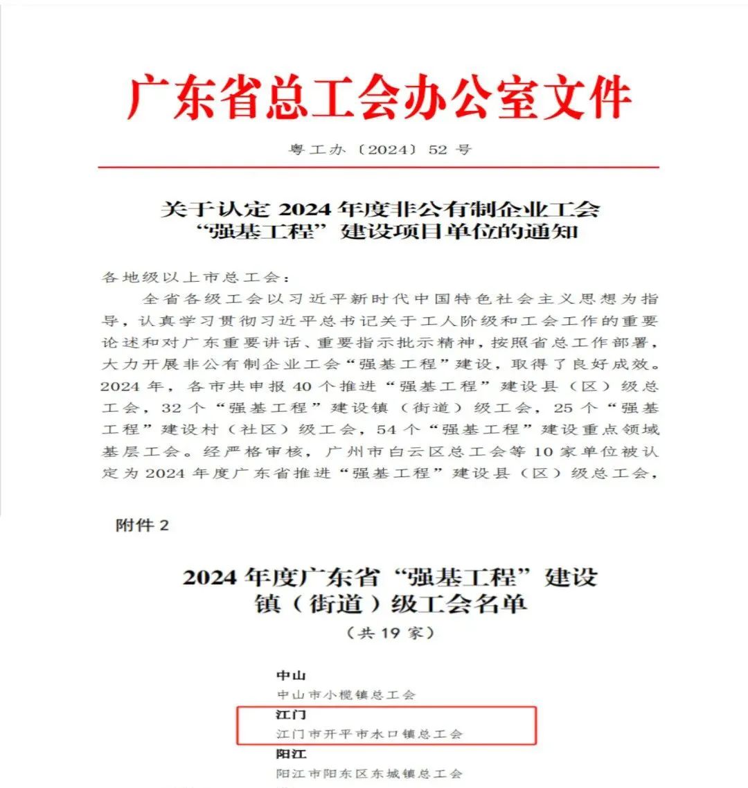 近日,廣東省總工會辦公室印發(fā)了《關于認定2024年度非公有制企業(yè)工會“強基工程”建設項目單位的通知》,開平市水口鎮(zhèn)總工會被認定為2024年度廣東省“強基工程”建設鎮(zhèn)(街道)級工會單位,是江門市唯一被認定的鎮(zhèn)街。