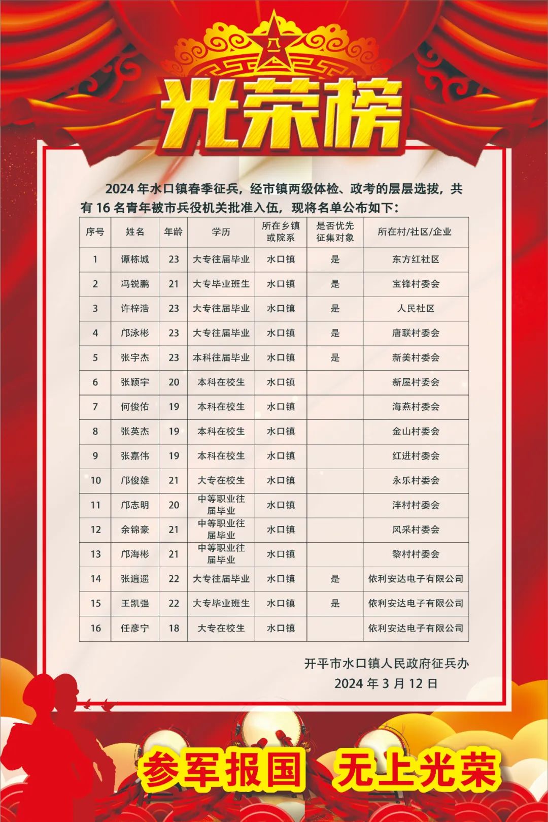 2024年春季征兵,水口鎮(zhèn)共有146名適齡青年報(bào)名應(yīng)征青年積極響應(yīng)國(guó)家號(hào)召,參加征兵體檢,接受嚴(yán)格挑選。經(jīng)過體檢、政考、定兵等環(huán)節(jié),水口鎮(zhèn)共有16名優(yōu)秀青年光榮入伍。