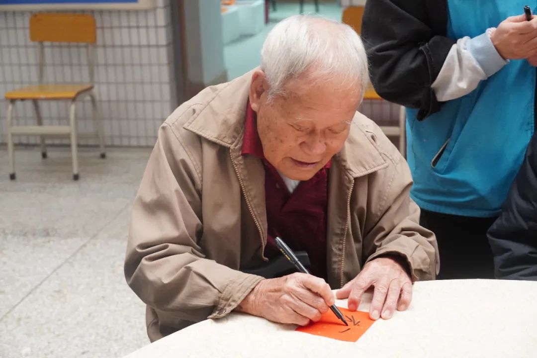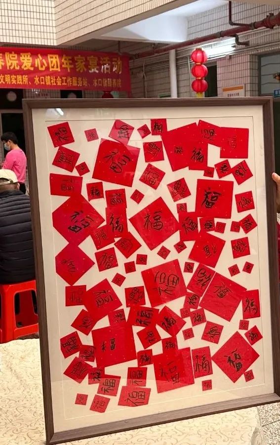 隨后開展的是“墨香寫福,喜納吉祥”活動,長者們在志愿者們的指導(dǎo)和協(xié)助下,將新年的祝福與美好的愿景融福字間。每一筆、每一劃,都寄托在老人們對新一年的美好愿望以及志愿者們對老人們的深深祝福。志愿者們把每一位長者書寫鮮艷飽滿的“?!弊侄际珍洷4娴较嗫蚶?,匯聚成“大”福氣,祝愿所有長者福壽安康,萬事順?biāo)臁?/span>