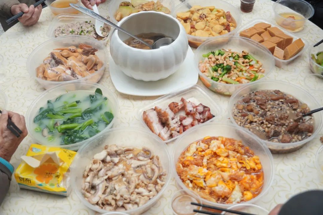 伴隨著互動環(huán)節(jié)的陣陣歡聲笑語,一道道香氣四溢、熱氣騰騰的菜肴也陸續(xù)端上餐桌。為了讓老人們在這頓團(tuán)年飯中盡享年味,又能滿足他們不同的口味偏好,院工和志愿者們充分考慮了老人們的口味和營養(yǎng)需求,精心準(zhǔn)備一場豐盛的年夜飯。白鴿參須湯、白切雞、燒味拼盤、豬手眉豆、香菇肉餅、甜酸蛋等等一道道本地應(yīng)節(jié)年味托起了老人們“舌尖上的幸福”。