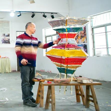 花燈制作是一項(xiàng)純手工的技藝,從選材到制作都非常講究。燈的規(guī)格大小、形式模樣,都有明確規(guī)定。花燈由燈芯、燈須、燈頭、燈肚、燈腳組成,重量約35斤。先用竹竿和竹篾扎制成框,用五色紙糊貼成形,再用金銀飾紙裝飾而成圖案瑰麗的彩燈。做花燈,最重要的就是耐心和細(xì)心。每一個(gè)細(xì)節(jié)都要處理得恰到好處,才能讓花燈既美觀又耐用。