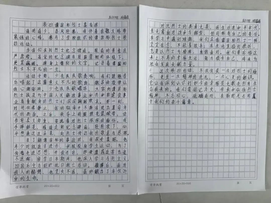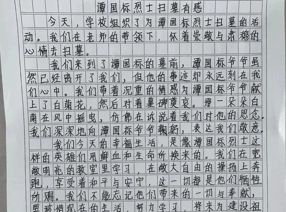 水口鎮(zhèn)紅花小學(xué)師生代表懷著無(wú)比崇敬的心情,前往譚國(guó)標(biāo)烈士紀(jì)念碑開(kāi)展清明祭掃活動(dòng)。蒼松翠柏掩映下的烈士紀(jì)念碑前,同學(xué)們面向紀(jì)念碑齊聲高唱中國(guó)少年先鋒隊(duì)隊(duì)歌,清脆嘹亮的歌聲飽含對(duì)先烈的追思與敬仰。隨后,全體人員整齊列隊(duì),肅立默哀。緊接著,全體在場(chǎng)師生依次獻(xiàn)上手中的鮮花,寄托對(duì)烈士的深深哀思與崇高敬意?;顒?dòng)結(jié)束后,同學(xué)們寫(xiě)下了自己對(duì)先烈的敬仰與追思,表示要繼承先烈遺志,勤奮學(xué)習(xí),努力成為棟梁之材,為實(shí)現(xiàn)中華民族偉大復(fù)興的中國(guó)夢(mèng)貢獻(xiàn)力量。