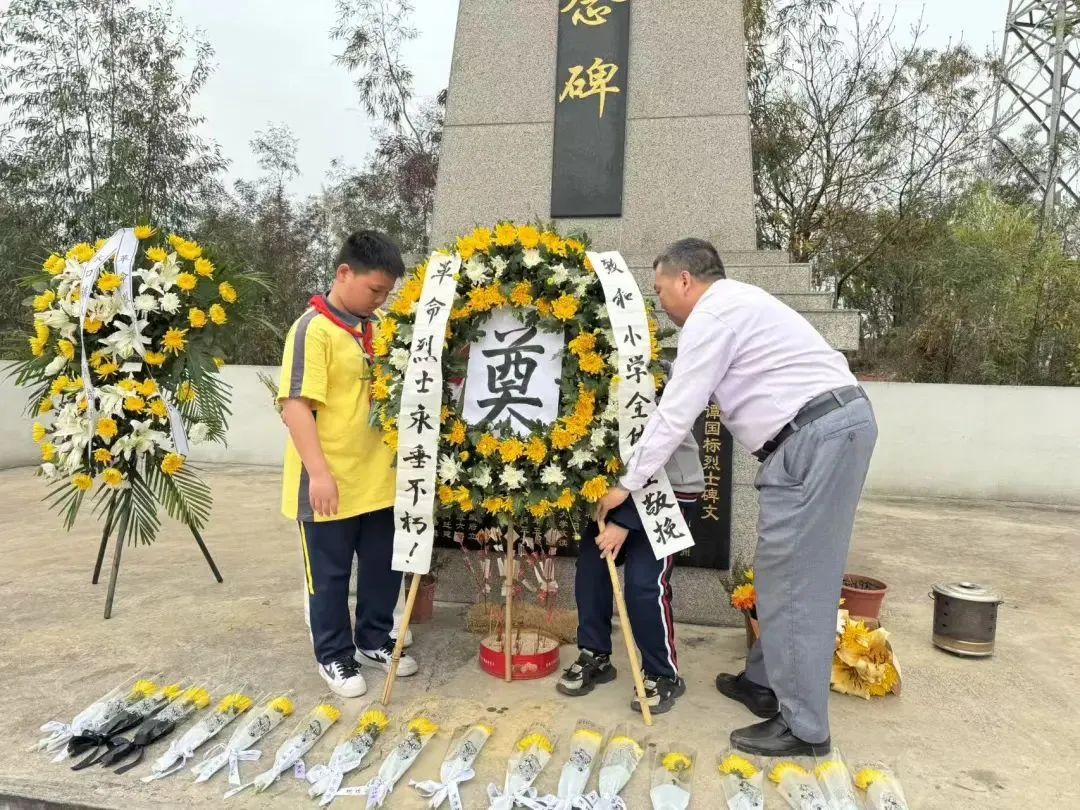 水口鎮(zhèn)致和小學(xué)精心組織開(kāi)展“傳承紅色基因,繼承革命精神——清明祭英烈”主題教育實(shí)踐活動(dòng)。在學(xué)校譚國(guó)標(biāo)烈士紀(jì)念館內(nèi),校領(lǐng)導(dǎo)為四年級(jí)師生帶來(lái)主題為“緬懷革命先烈,弘揚(yáng)民族精神——向譚國(guó)標(biāo)烈士學(xué)習(xí)”的思政課,勉勵(lì)同學(xué)們珍惜幸福時(shí)光,刻苦努力學(xué)習(xí)。隨后,學(xué)校師生代表來(lái)到譚國(guó)標(biāo)烈士紀(jì)念碑開(kāi)展清明祭掃活動(dòng),并組織宣誓,將英雄精神內(nèi)化為信念,外化為行動(dòng)。