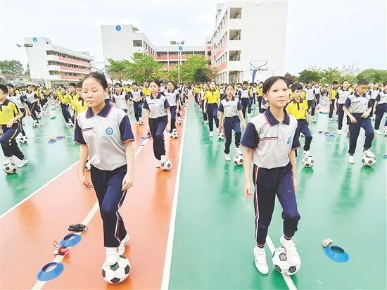 水口鎮(zhèn)第三小學(xué)的“足球馬克操”將球技展示與韻律結(jié)合,學(xué)生運(yùn)球、轉(zhuǎn)身動作精準(zhǔn)如教科書