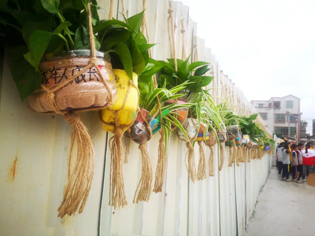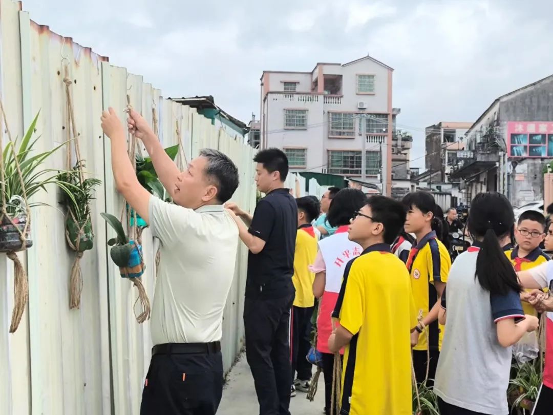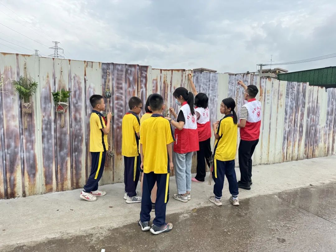 活動(dòng)當(dāng)日,在莊嚴(yán)的《綠美行動(dòng)倡議書(shū)》宣讀聲中,共建行動(dòng)正式啟動(dòng)。師生分組協(xié)作,將創(chuàng)意花瓶通過(guò)掛鉤、麻繩等工具有序懸掛至學(xué)學(xué)校大門(mén)前廠(chǎng)房鐵皮外墻及周邊指定公共區(qū)域。