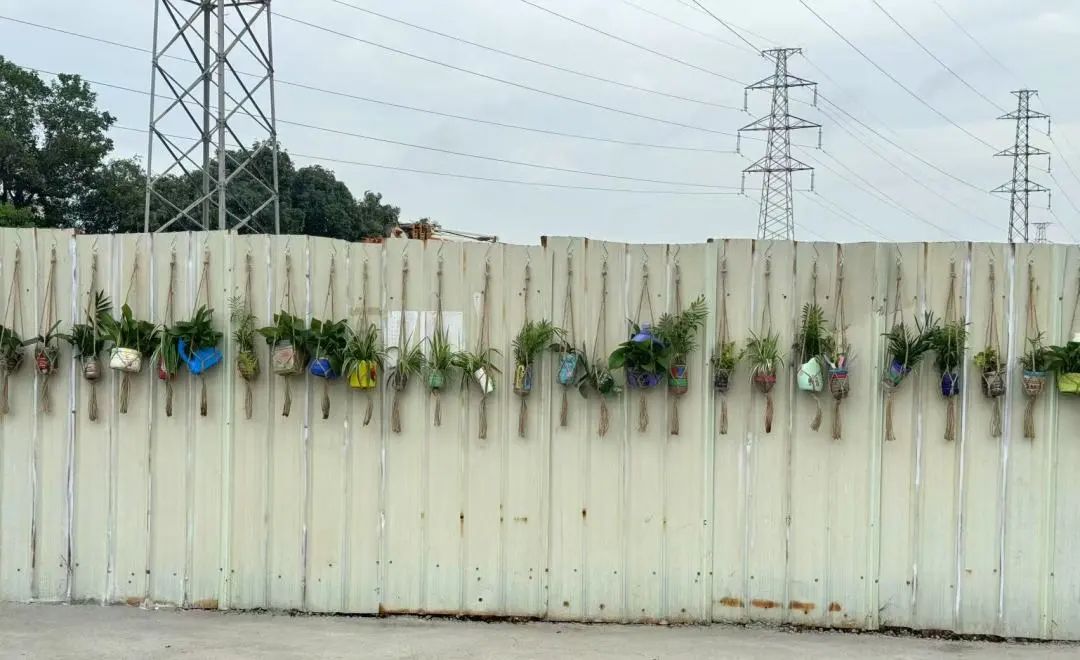 一個(gè)個(gè)承載著奇思妙想的花瓶里,綠植蓬勃生長(zhǎng),與鄉(xiāng)村風(fēng)貌相映成趣,原本單調(diào)的鐵皮墻搖身變?yōu)?“會(huì)呼吸的藝術(shù)長(zhǎng)廊”。