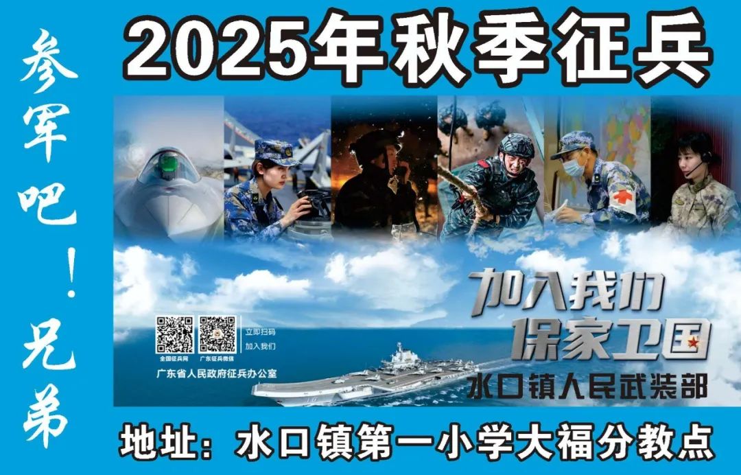 水口鎮(zhèn)2025年下半年秋季征兵體檢工作將于7月28日(下周一)在開(kāi)平市水口鎮(zhèn)第一小學(xué)大福分教點(diǎn)進(jìn)行。