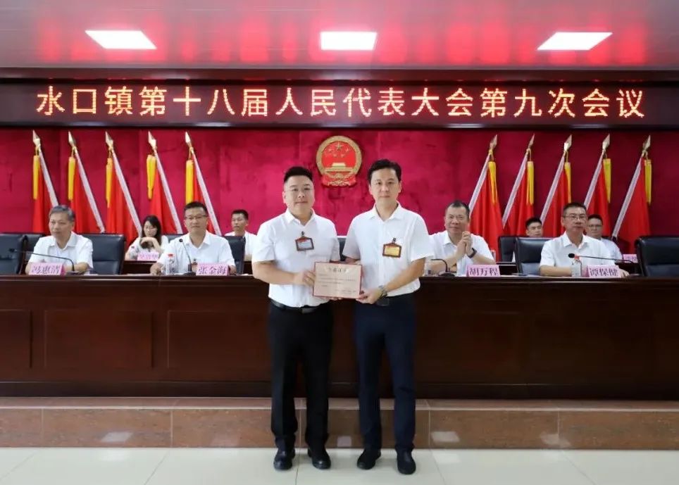 水口鎮(zhèn)黨委書記司徒錦泉向新當(dāng)選的水口鎮(zhèn)人民政府副鎮(zhèn)長(zhǎng)劉彬彬頒發(fā)當(dāng)選證書