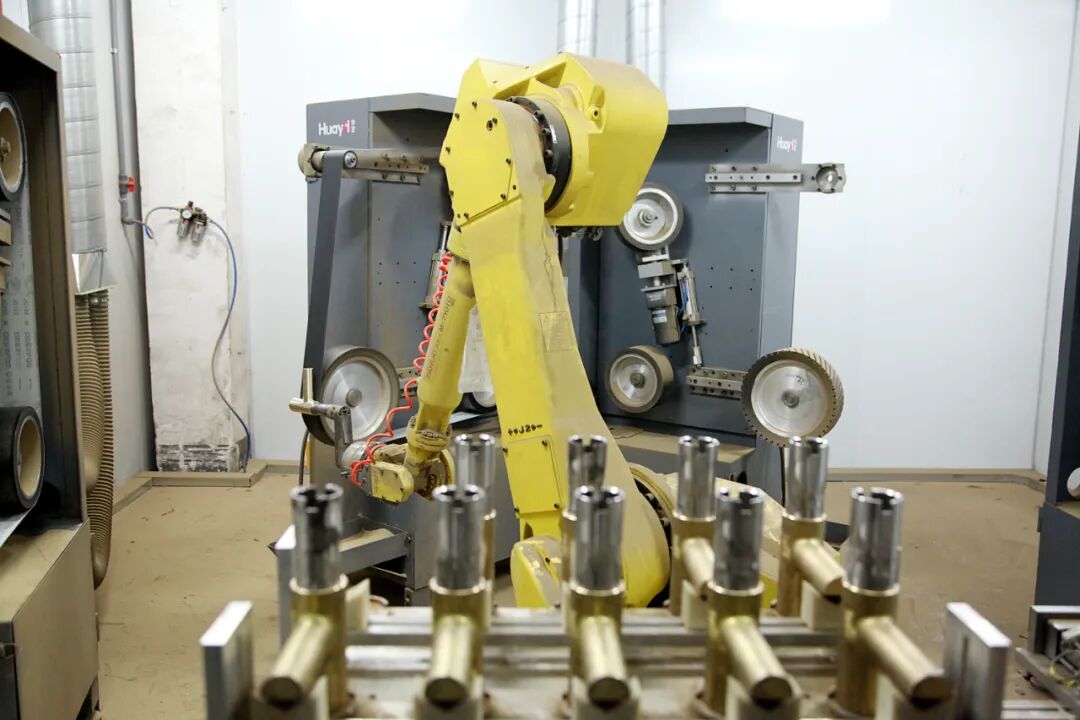 在華藝衛(wèi)浴的自動(dòng)化生產(chǎn)車間,機(jī)械臂高速運(yùn)轉(zhuǎn),一批批高端水龍頭即將下線