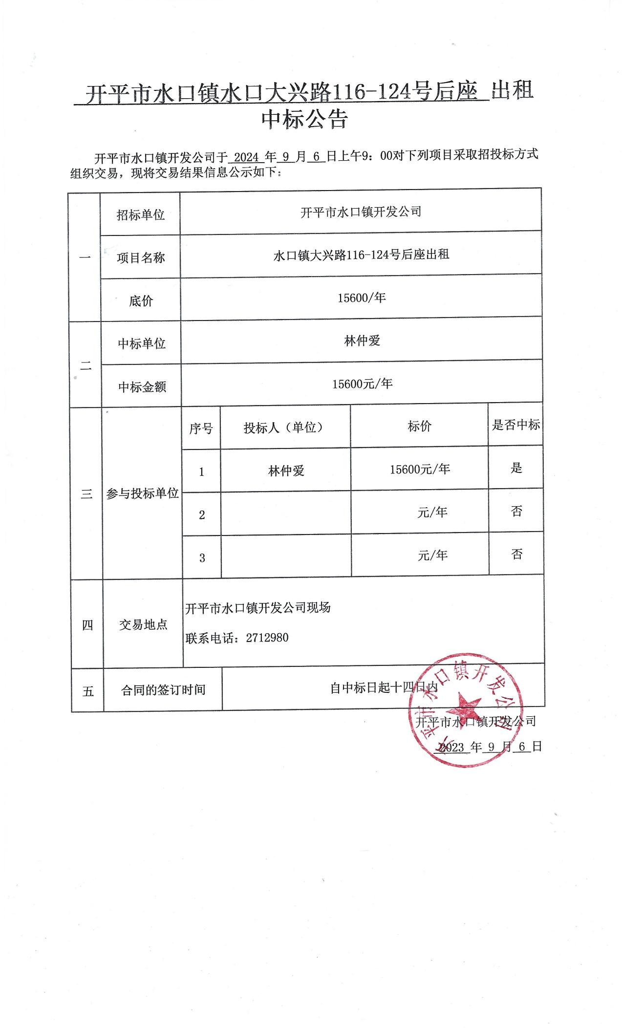 開平市水口鎮(zhèn)水口大興路116-124號后座出租中標(biāo)公告