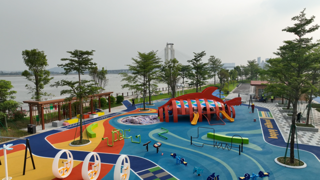 潭江生態(tài)濕地長廊項目位于開平市水口新美片區(qū)潭江大道南側(cè),東起東九路,西至西三路,南至現(xiàn)狀碧道,呈帶狀分布,面積約4公頃。項目主要建設內(nèi)容為海綿城市建設元素、停車場、健身跑道、休閑運動場、綠化工程、照明工程等,其中兒童樂園面積約1630平方米,設置有大魚滑梯、兒童健身器材、蹦床、攀爬網(wǎng)、攀巖點等安全、有趣的兒童設施。