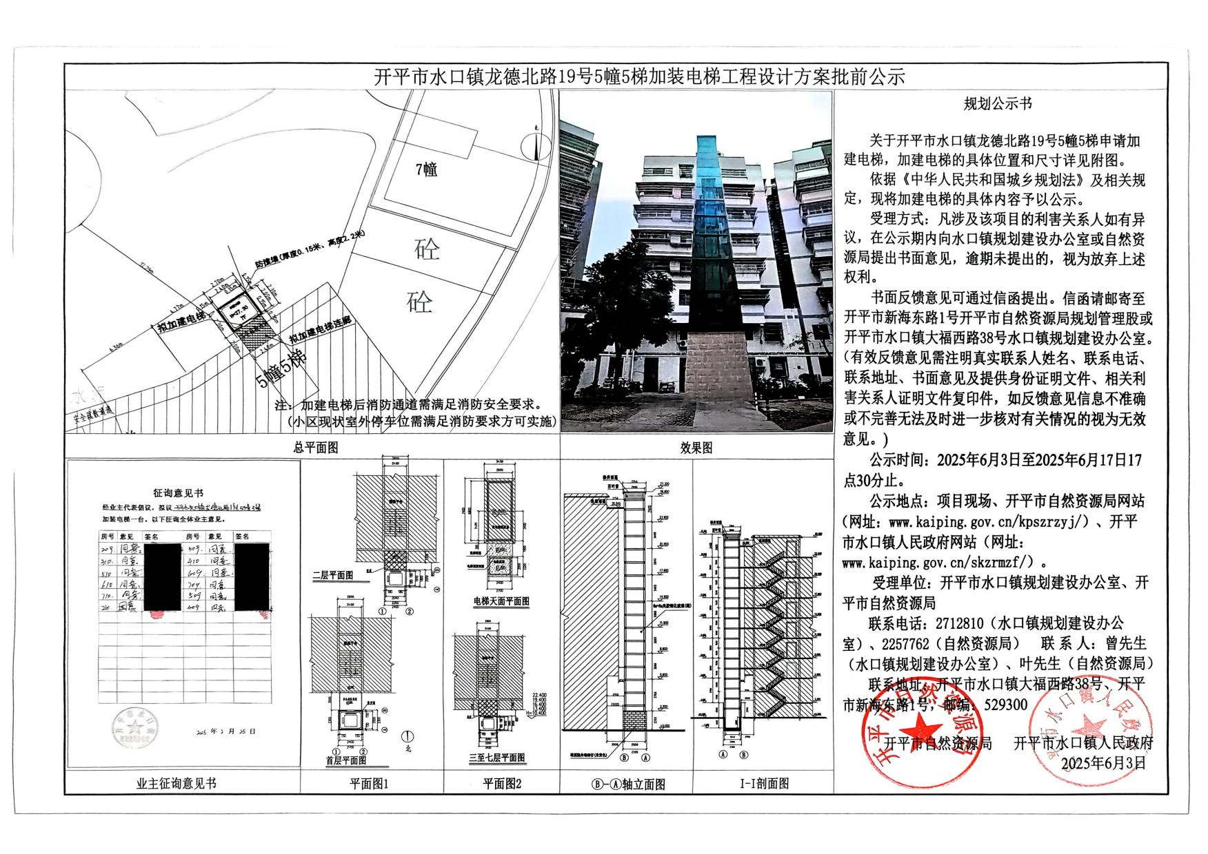 關(guān)于開(kāi)平市水口鎮(zhèn)龍德北路19號(hào)5幢5梯申請(qǐng)加建電梯,加建電梯的具體位置和尺寸詳見(jiàn)附圖。