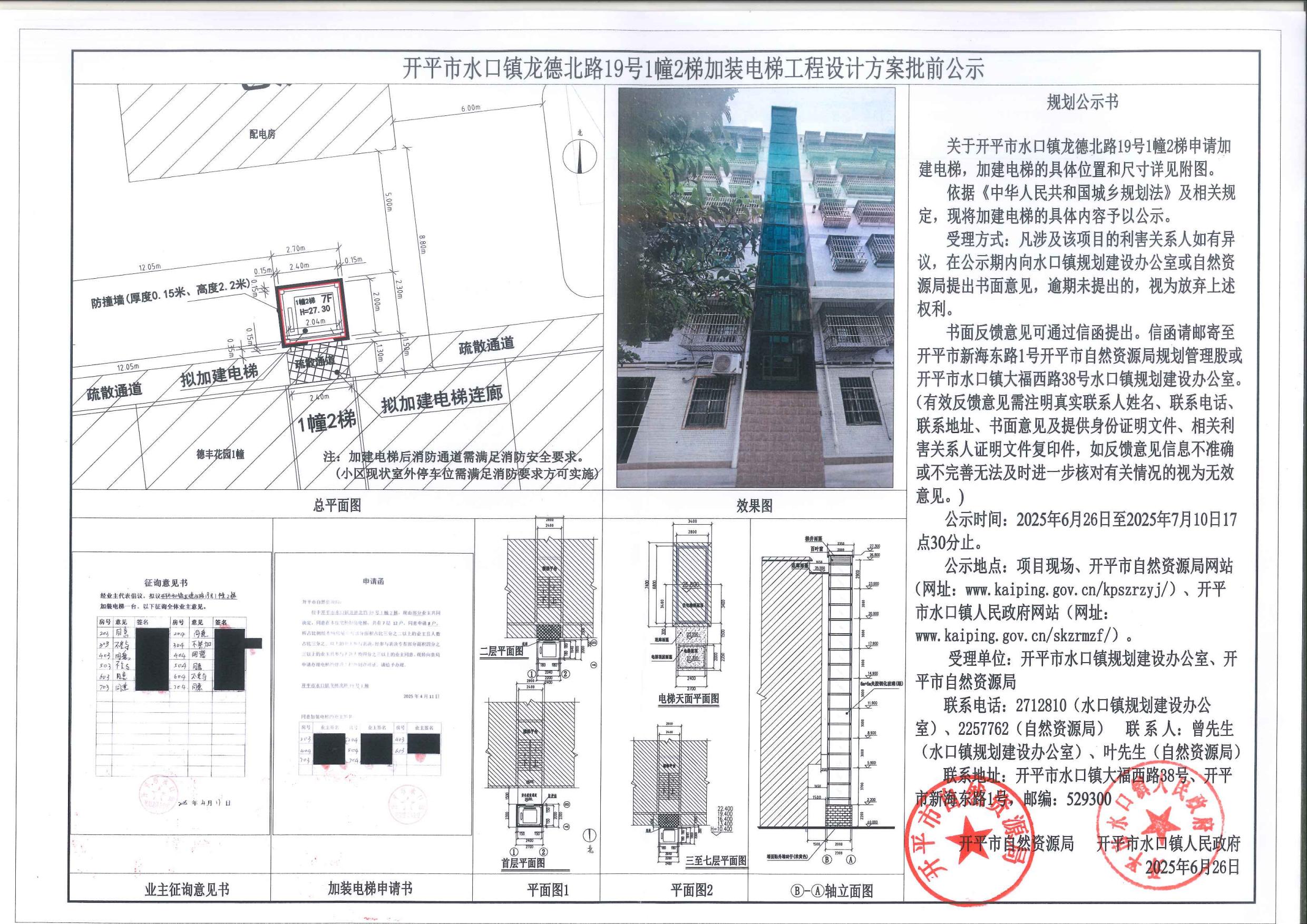 關(guān)于開平市水口鎮(zhèn)龍德北路19號(hào)1幢2梯申請(qǐng)加建電梯,加建電梯的具體位置和尺寸詳見附圖。