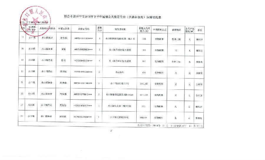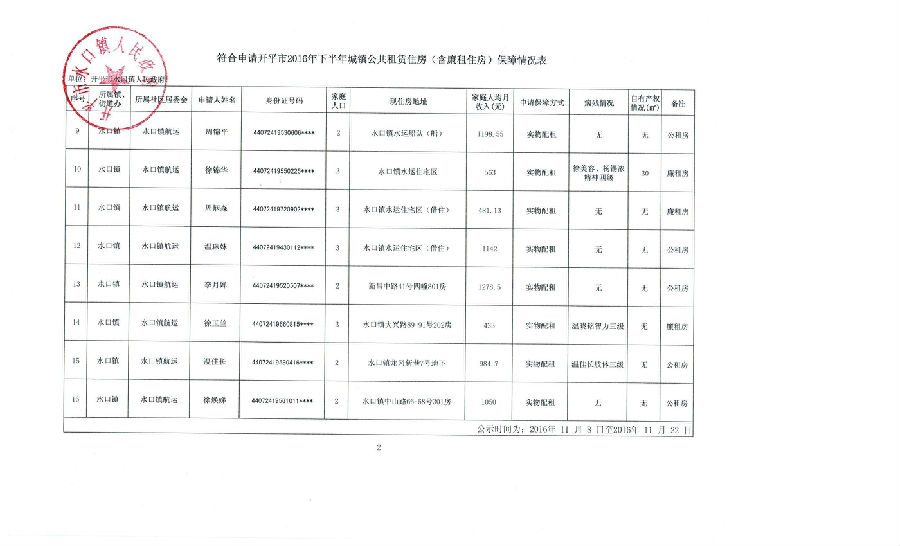 符合申請開平市2016年下半年城鎮(zhèn)公共租賃住房(含廉租住房)保障情況表