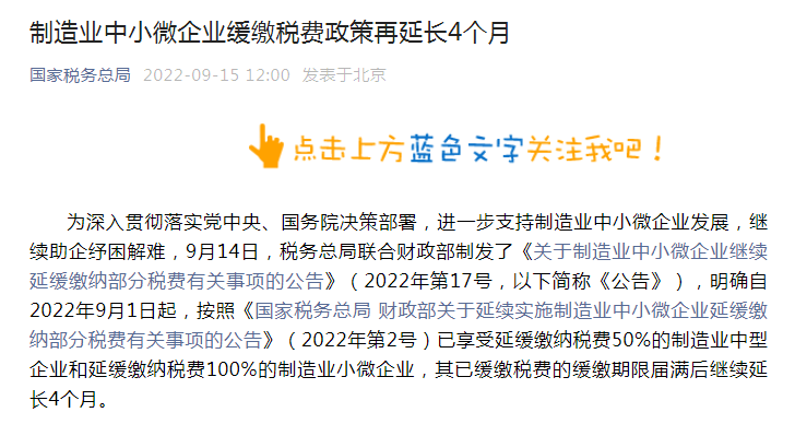 為深入貫徹落實黨中央、國務(wù)院決策部署,進一步支持制造業(yè)中小微企業(yè)發(fā)展,繼續(xù)助企紓困解難,9月14日,稅務(wù)總局聯(lián)合財政部制發(fā)了《關(guān)于制造業(yè)中小微企業(yè)繼續(xù)延緩繳納部分稅費有關(guān)事項的公告》(2022年第17號,以下簡稱《公告》),明確自2022年9月1日起,按照《國家稅務(wù)總局 財政部關(guān)于延續(xù)實施制造業(yè)中小微企業(yè)延緩繳納部分稅費有關(guān)事項的公告》(2022年第2號)已享受延緩繳納稅費50%的制造業(yè)中型企業(yè)和延緩繳納稅費100%的制造業(yè)小微企業(yè),其已緩繳稅費的緩繳期限屆滿后繼續(xù)延長4個月。