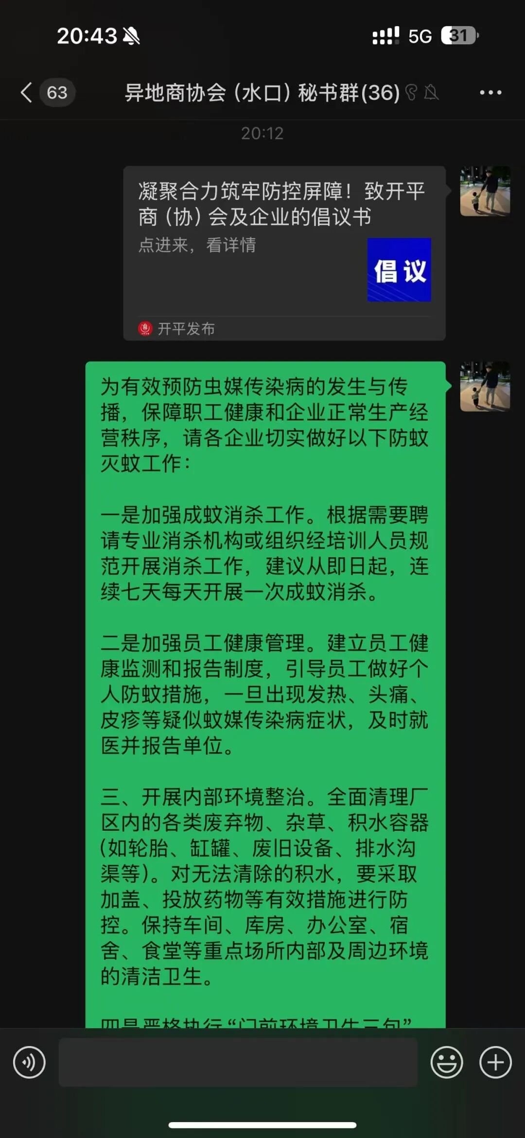 當(dāng)前,全市正處于防控基孔肯雅熱疫情的關(guān)鍵時(shí)期。為凝聚政企同心抗疫合力,筑牢企業(yè)疫情防控防線,保障人民群眾身體健康,在水口鎮(zhèn)黨委、政府的倡議號(hào)召下,水口鎮(zhèn)“兩新”黨組織和黨員、各商(協(xié))會(huì)迅速響應(yīng)、沖鋒在前,踴躍投入到疫情防控工作中,多措并舉筑牢蚊媒防控屏障,以實(shí)際行動(dòng)彰顯責(zé)任與擔(dān)當(dāng)。