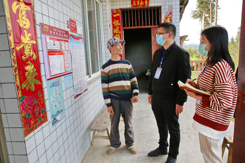 紀(jì)檢監(jiān)察干部向四川洪雅縣中山鎮(zhèn)鄒崗村建檔立卡貧困戶楊德彬(左一)核實產(chǎn)業(yè)扶貧資金落實情況(2020年3月18日攝)。新華社記者 江宏景 攝