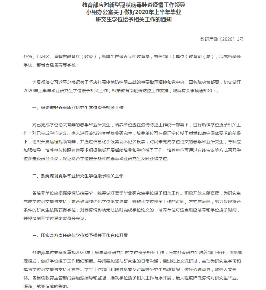 教育部日前印發(fā)《關(guān)于做好2020年上半年畢業(yè) 研究生學(xué)位授予相關(guān)工作的通知》,明確可組織已完成學(xué)位論文春季畢業(yè)研究生開展遠(yuǎn)程視頻答辯;合理調(diào)整優(yōu)化夏季畢業(yè)研究生學(xué)位論文送審、答辯和學(xué)位授予工作的時(shí)間、方式與流程。