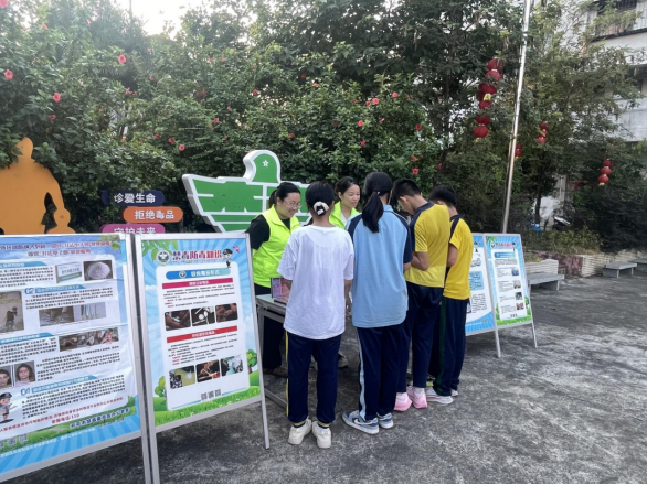 賽場下,禁毒社工向場外的球員們、觀看比賽的群眾派發(fā)禁毒宣傳單張、展示仿真毒品模型,用通俗易懂的話語向他們講解《禁毒法》、“6·26”國際禁毒日、毒品的種類及如何防范毒品等知識,并著重介紹了新型毒品依托咪酯“上頭”電子煙的危害及防范措施。